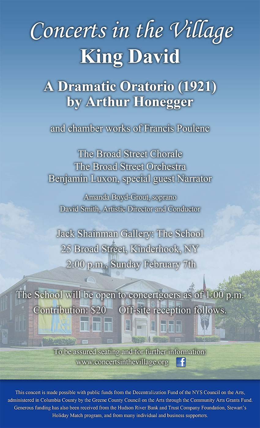 Concerts in the Village (CITV) continues its sixth season at 2:00 p.m. on Sunday, February 7th with Arthur Honegger’s powerful oratorio King David, in its original 1921 orchestration. The concert will be held at the Jack Shainman Gallery: The School, in the Village of Kinderhook. The School is one of the region’s newest and most interesting architectural transformations, and is fast becoming an international destination for art lovers. Led by David Smith, CITV’s Artistic Director and Conductor, this dramatic work will feature over 50 performers, including the Broad Street Chorale, the Broad Street Orchestra, soprano Amanda Boyd-Grout, mezzo soprano Vicki Smith, tenor David Rudnick, speaker Wendy Spielmann, and as Narrator, Benjamin Luxon. CITV is honored that Luxon will be delivering the moving narration of King David. Well known as a speaker and actor, Luxon’s distinguished earlier career as a singer earned him accolades all over the world. His memorable baritone voice was heard in a wide range of operatic, orchestral and recital repertoire. Luxon performed in nearly every major opera house, in addition to frequent appearances with the world’s great orchestras, including the Boston Symphony. “I cannot imagine a more compelling voice to narrate King David – rich, direct, beautifully modulated, in a word unforgettable.” says Smith. “That Benjamin Luxon will be with us is truly special.” King David recounts in the most colorful musical terms the life of David, including his time as a shepherd, victories in battle, rise to power, pursuit of another’s man’s wife, painful distress at his son’s death, disregard of God, and moving end of life. For Smith “This story has it all and Honegger’s music – somehow created in a mere two months! – spares no emotion. King David is justly popular.” In addition to the Honegger oratorio, the program includes chamber works of his fellow composer Francis Poulenc, performed by flutist Elizabeth Chinery and pianists Noah Palmer and David Smith. This will be CITV’s 17th performance since in founding in 2010. As the late critic John Paul Keeler has written: “Concerts in the Village is fast becoming a major musical treasure.” Contribution of $ 20 includes an off-site reception immediately following. The Jack Shainman Gallery: The School is at 25 Broad Street (US Route 9) in the Village of Kinderhook.