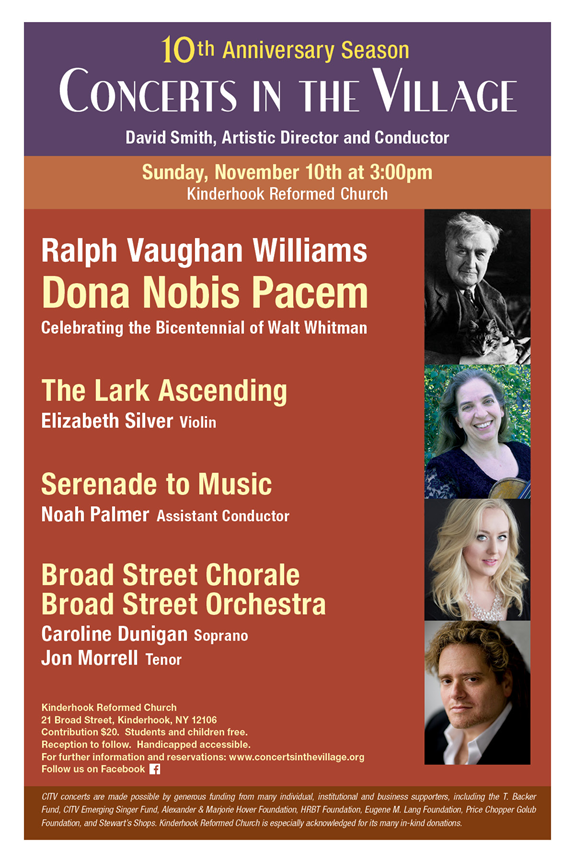 Concerts in the Village continues its 10th Anniversary Season on Sunday November 10th when the Broad Street Chorale, the Broad Street Orchestra and soloists perform well-known works of Ralph Vaughan Williams, one of 20th c. Britain’s most important and popular composers. Included will be the Serenade to Music (1938), The Lark Ascending (1914-1921) with soloist Elizabeth Silver, and the dramatic oratorio Dona nobis pacem (1936) setting texts primarily by Walt Whitman. With the oratorio CITV honors the 200th anniversary of Whitman’s birth.